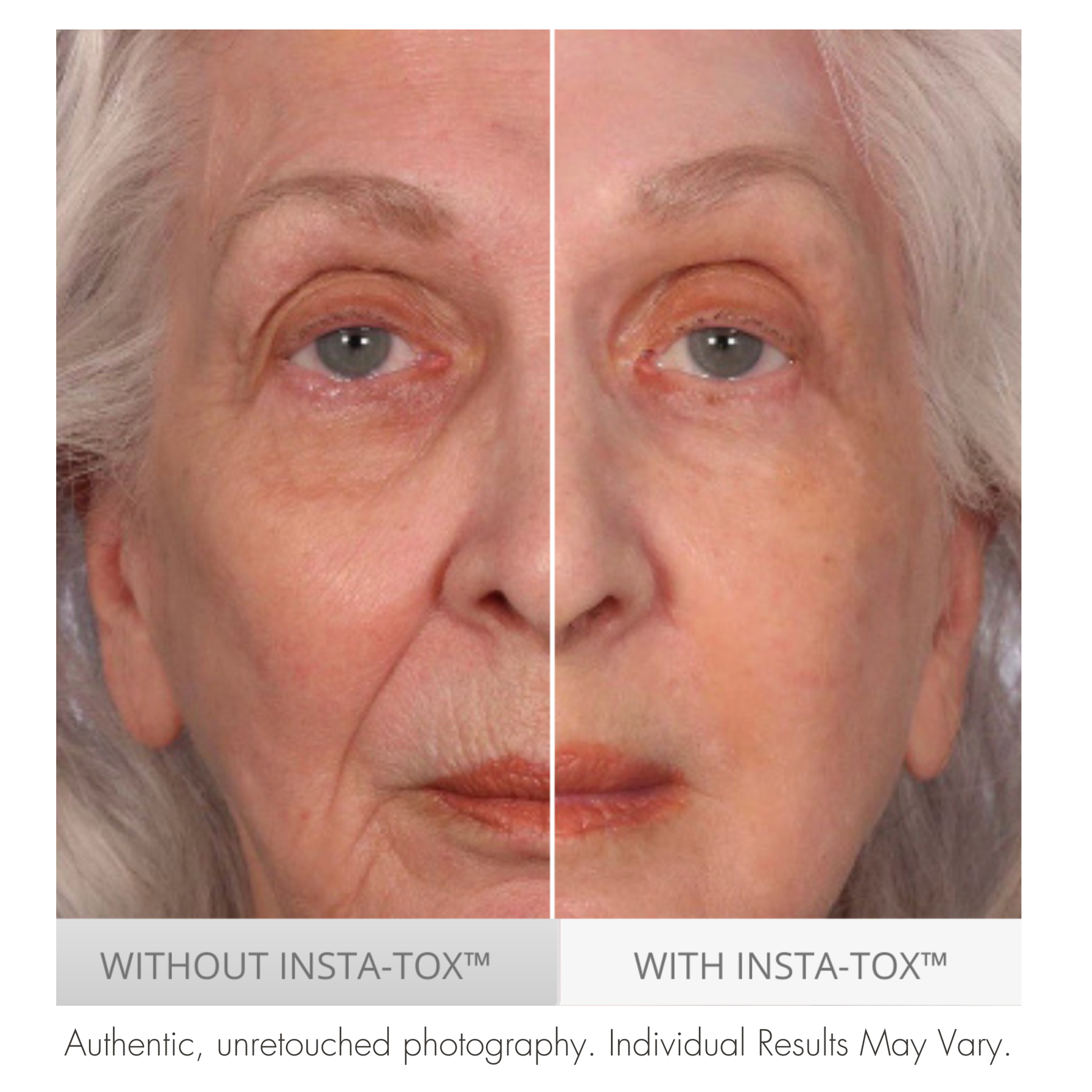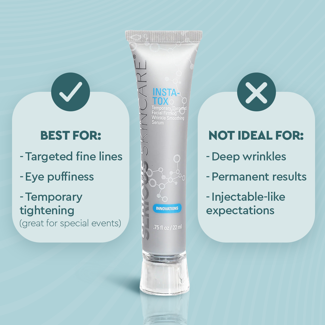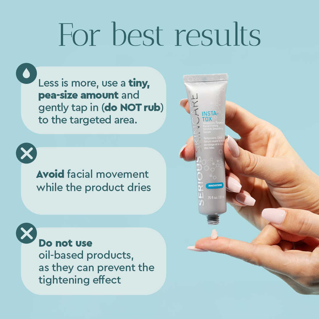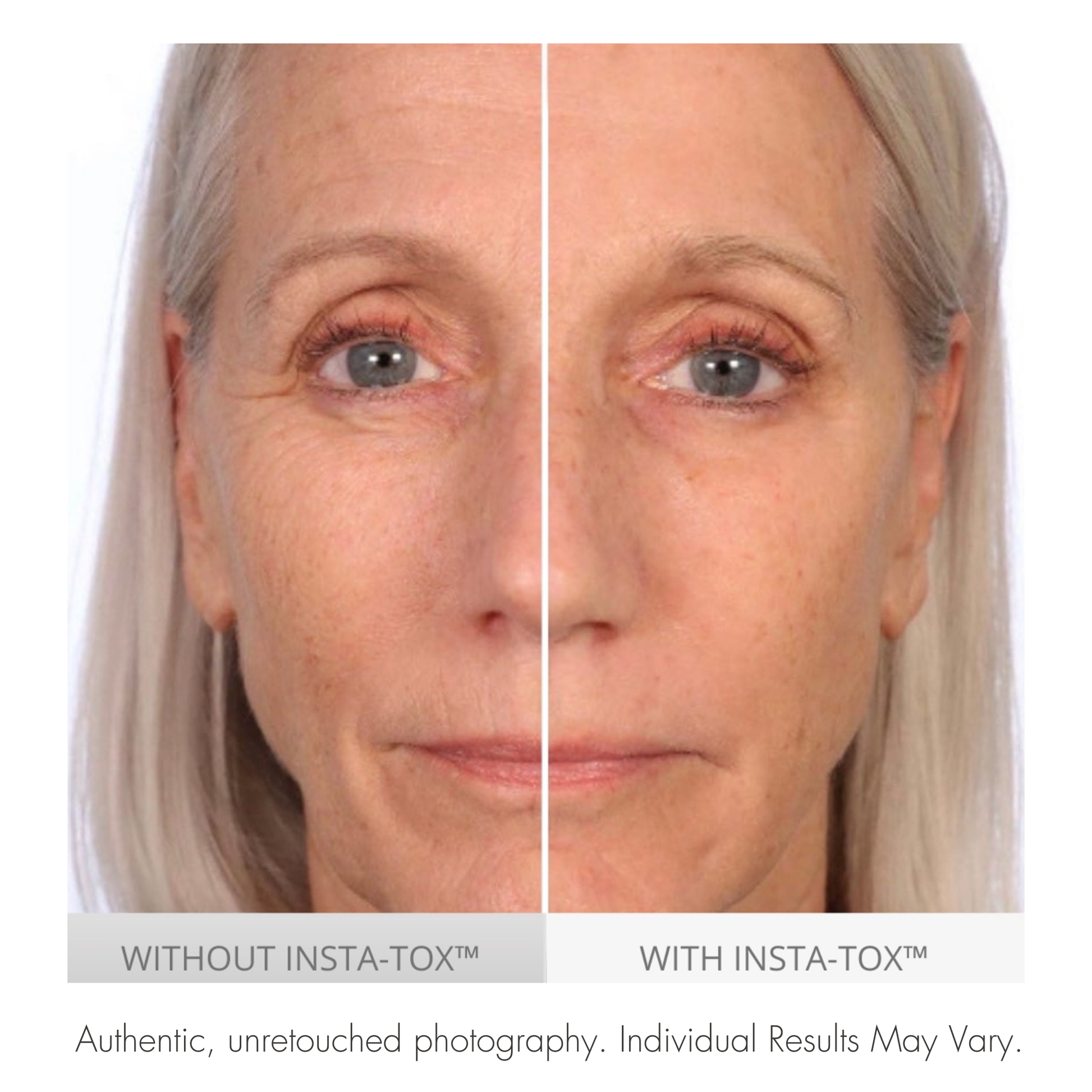 Get tighter, more lifted, smoother-looking skin in minutes with InstaTox. Instantly experience temporarily filled-in deep lines and wrinkles. Blurred pores, and minimize crow’s feet and temporarily diminish under-eye puffiness. With over 10 million units sold, this targeted age eraser is our #1 solution to temporarily eliminate wrinkles.
